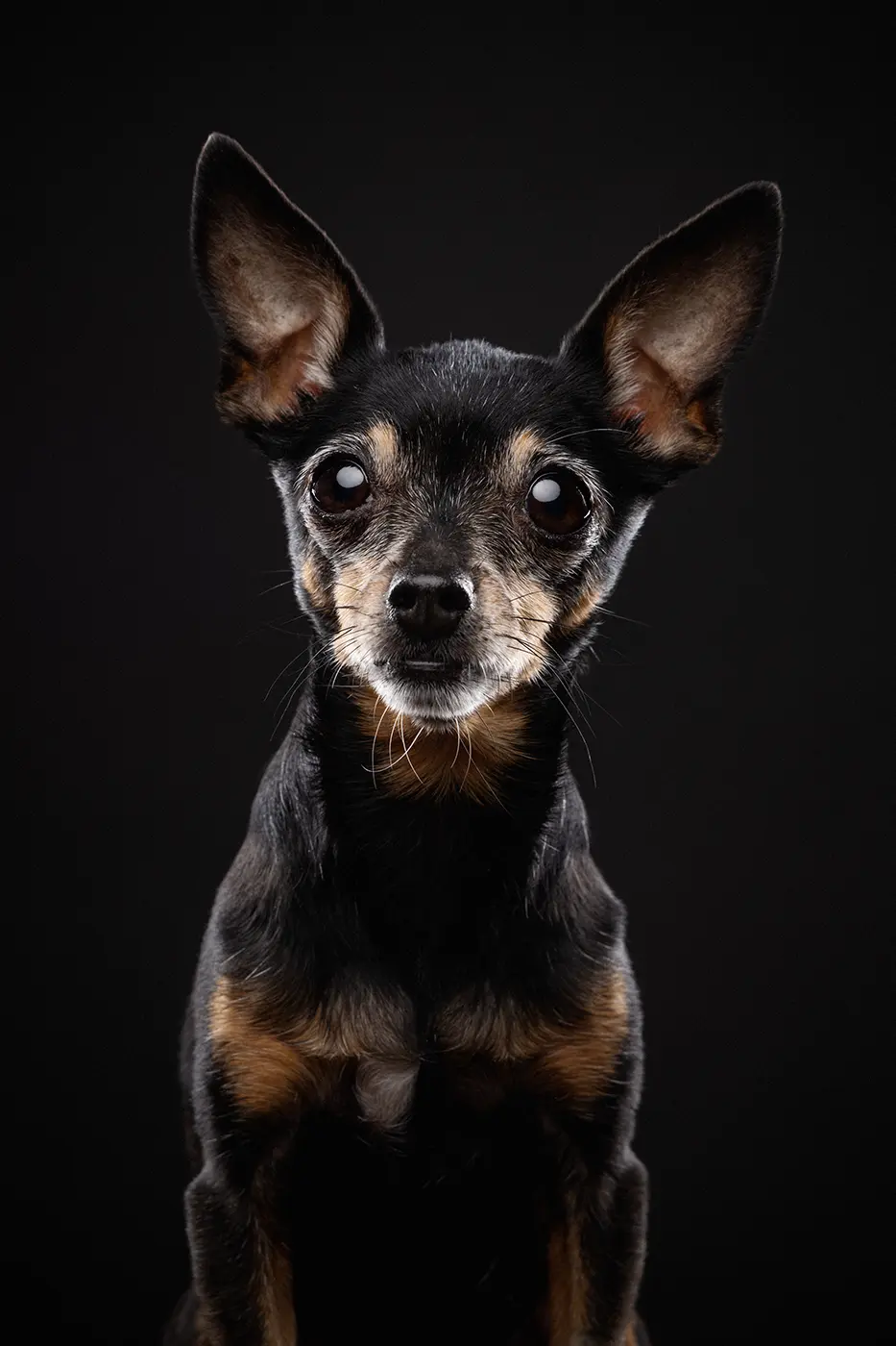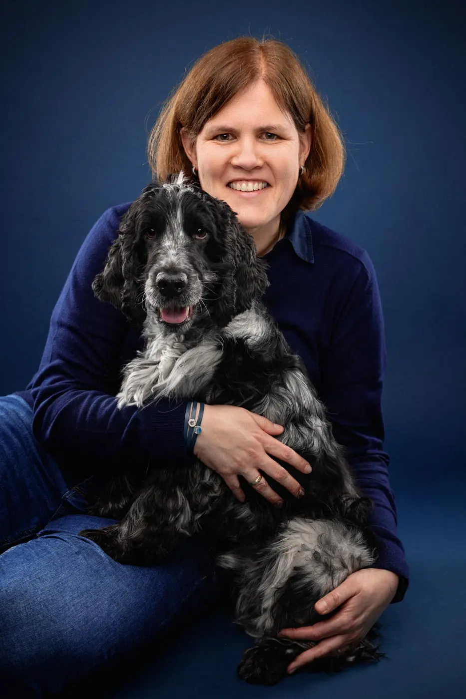 Es gab an diesem Tag aber auch einen Hund, für den der Studio-Aufbau und der Blitz einfach zu gruselig waren. Auch im Arm von Frauchen fühlt es sich für ihn einfach nicht gut für ihn an und so haben wir seine Bedürfnisse ganz klar ernst genommen und das Fotoshooting abgebrochen. Das gehört für mich als professionelle Fotografin dazu – ich dränge keinen Hund zu etwas, das ihm Angst macht. Schließlich wollen wir authentische und glückliche Momente einfangen, keine gestressten Tiere. Ein großes Danke an die Besitzerin für das Vertrauen! Anstatt weiterzumachen, haben wir direkt umgeplant: Wir verlegen das Shooting einfach nach draußen. So bekommt der kleine Kerl die Ruhe und den Abstand, den er braucht, um sich vor der Kamera richtig wohlzufühlen.