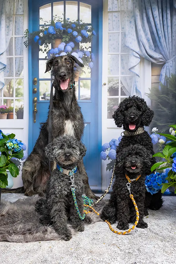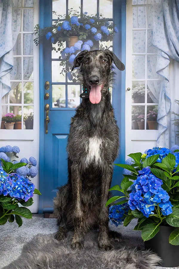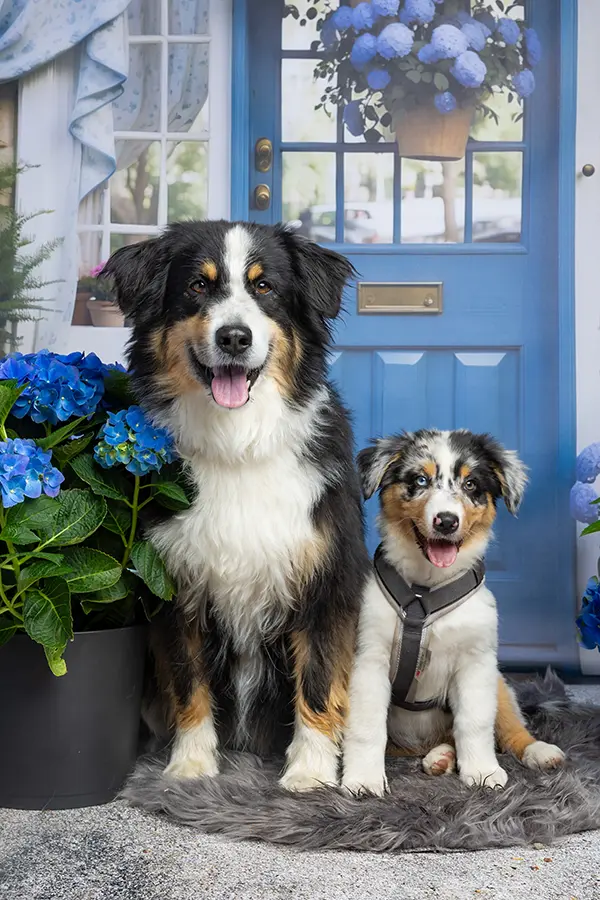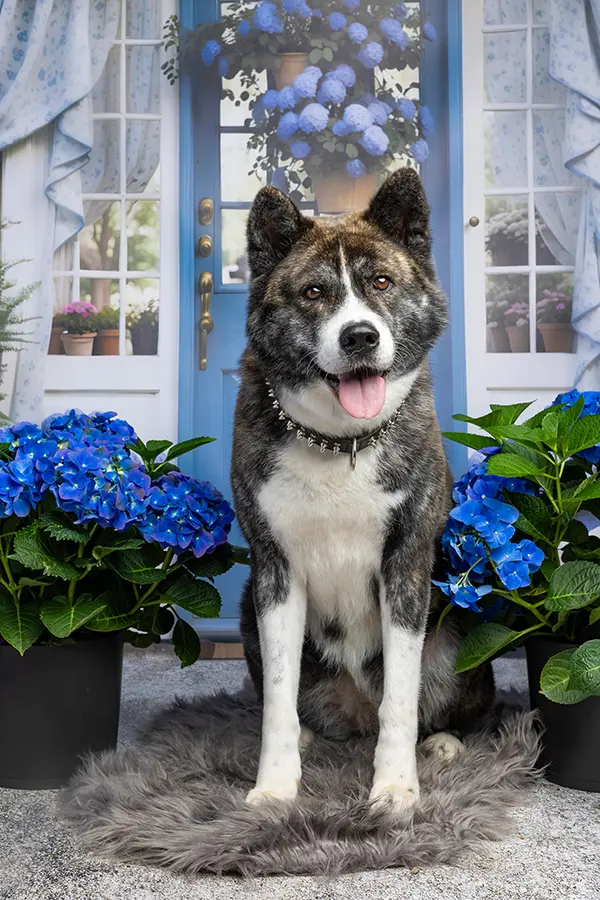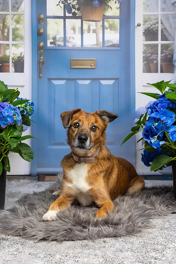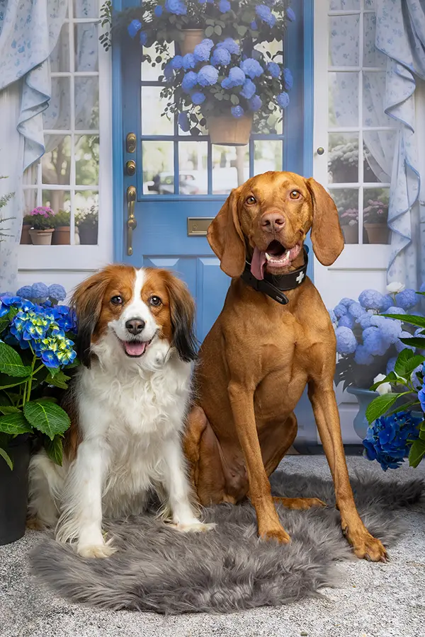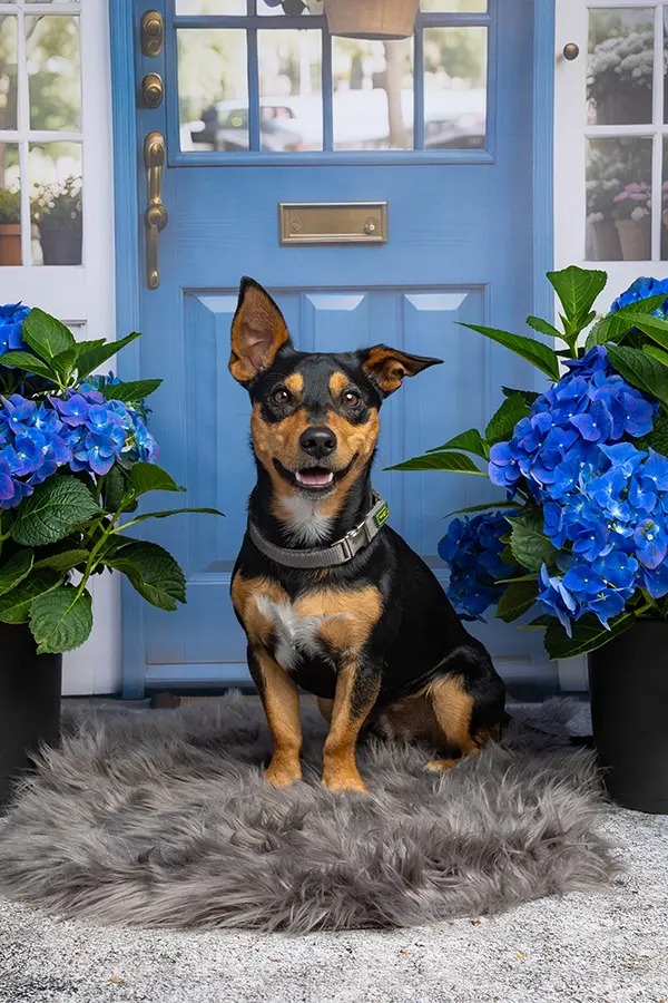 Bei unserem Hundefotoshooting ZooRoyal Niendorf im Juli 2024 wurde es nie langweilig! Für dieses besondere Sommerfest-Shooting hatten wir uns ein charmantes Set überlegt: Eine elegante blaue Haustür, eingerahmt von leuchtend blauen Hortensien.